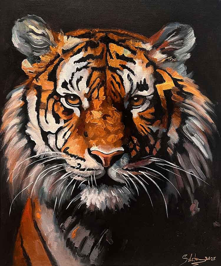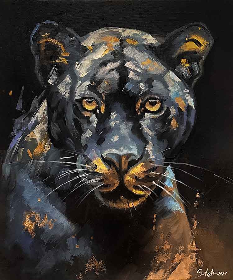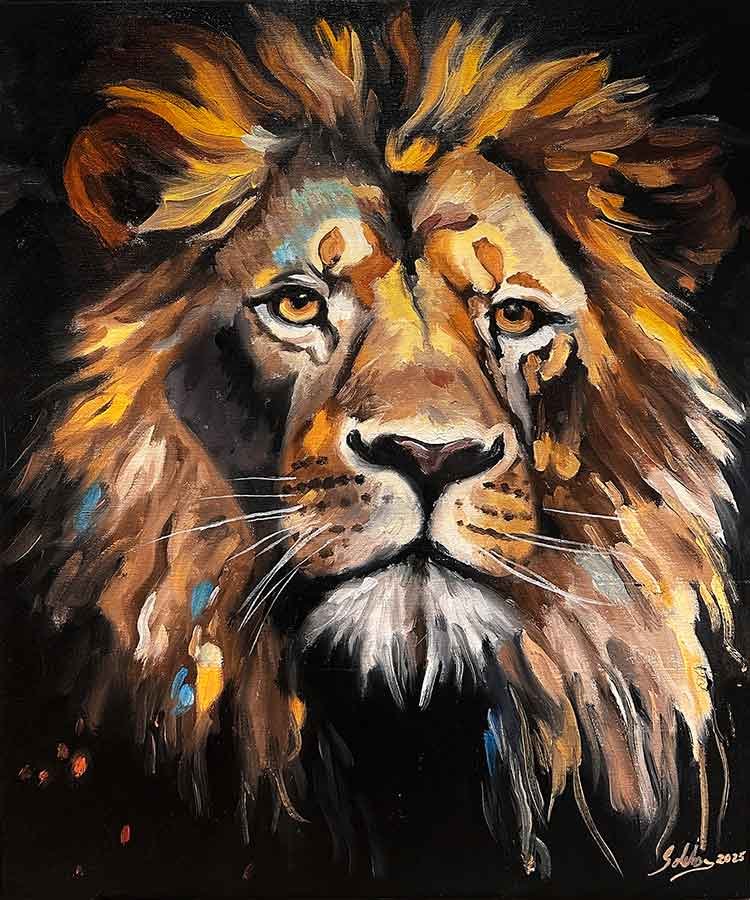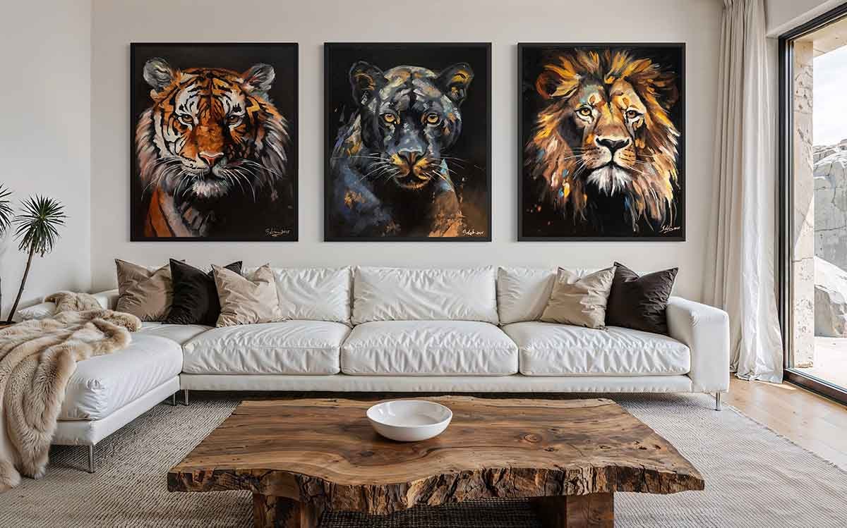 El resultado fue una serie de tres obras originales que representan a un león, una pantera negra y un tigre, pintados con un lenguaje visual vibrante, lleno de contrastes y texturas. Cada animal está tratado con una expresividad propia: la fuerza del león, la elegancia silenciosa de la pantera y la energía intensa del tigre. En conjunto, crean una composición equilibrada y visualmente impactante que ahora luce como pieza central en el salón de Andrés.