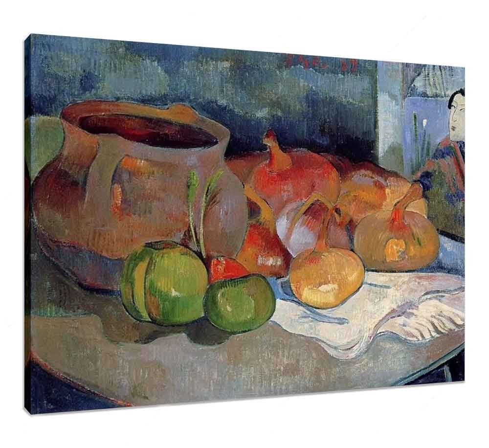 La composición se organiza sobre una mesa vista en ligero escorzo, donde cebollas, frutas y un gran recipiente cerámico se agrupan de forma compacta, creando un conjunto estable y rotundo. A la derecha de la escena aparece una figura japonesa, un elemento especialmente significativo que introduce una dimensión cultural y simbólica en el bodegón. Esta presencia remite al interés de Gauguin por el japonismo, muy presente en el arte europeo de finales del siglo XIX, y rompe con la idea clásica de naturaleza muerta puramente descriptiva.