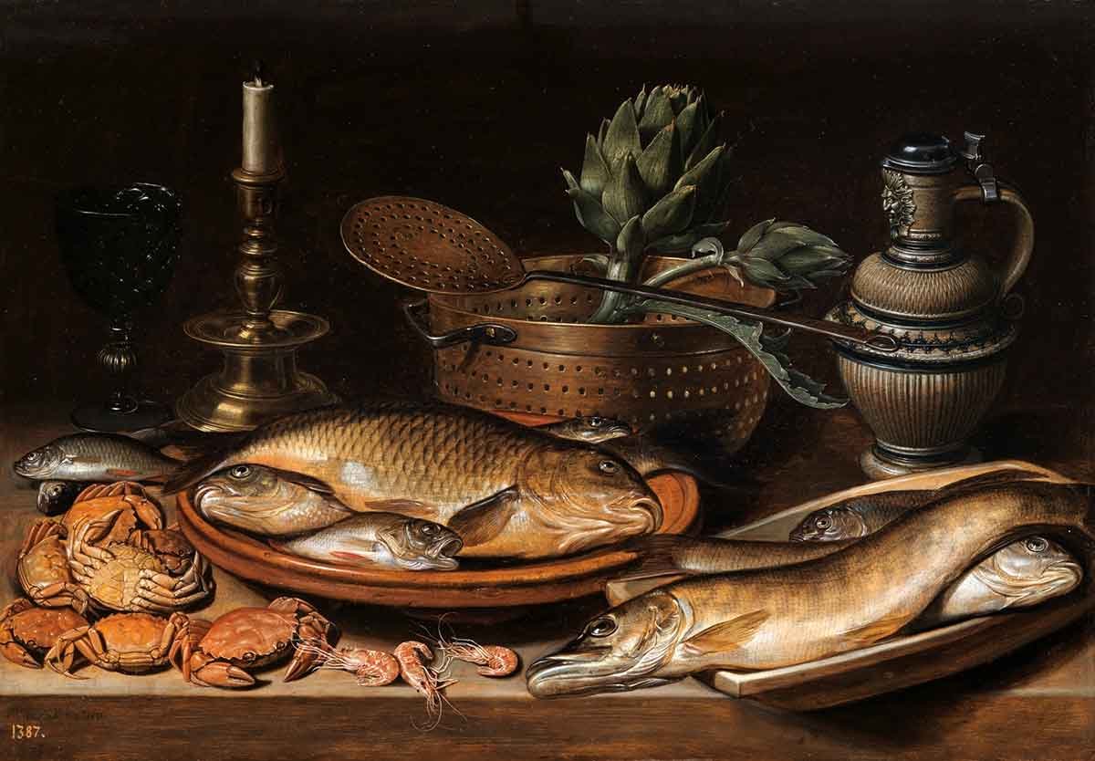 «Bodegón con pescado, vela, alcachofas, cangrejos y gambas» de Clara Peeters «Museo del Prado»