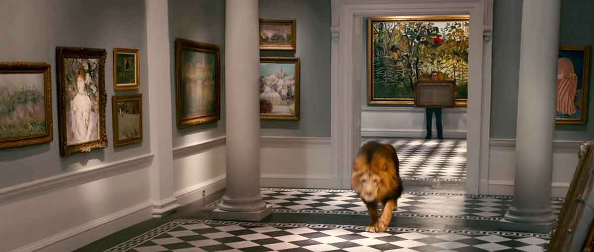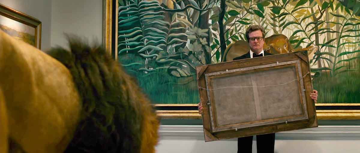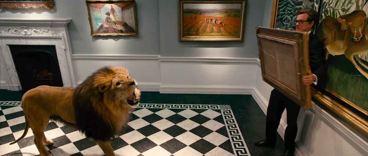 En este fotograma, Harry Deane (Colin Firth) sostiene un cuadro del que se ve la parte posterior, mientras intenta huir de un león.