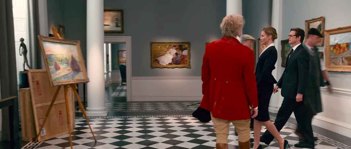 En este fotograma de la película podemos ver a los personajes principales de la trama, entrando en una sala por supuesto repleta de cuadros.